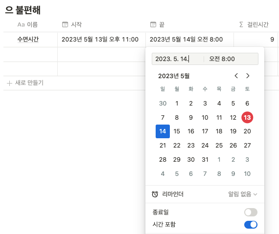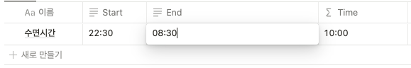 노션에서 시작시각과 종료시각을 각각 다른 칸에 적고, 알아서 시작부터 종료까지 걸린 시간을 계산해줬으면 좋겠을때요! 예를 들면, 몇시에 잠들었고 몇시에 일어났다를 입력하면, 짜잔! 하고 몇시간 잤다고 알려주는거죠! 이럴 때는 보통 "날짜"로 속성을 만들어서 시각 포함을 한다음 계산하곤 하는데요. 노션의 치명적인 단점은 그렇게 하는 경우, 시각만 보고 싶은데 쓸데없이 날짜까지 같이 봐야하고... 입력도 귀찮아지죠...