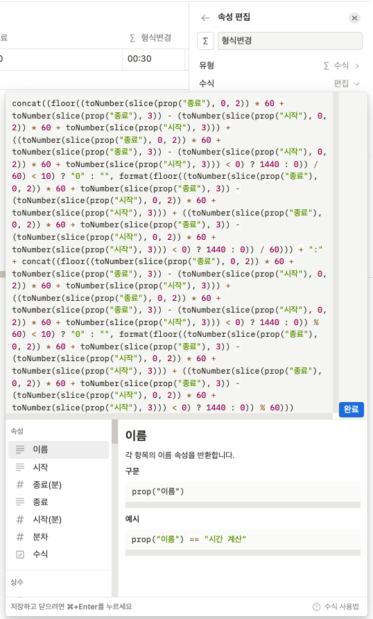 - 수식에 있는 모든 종료를 찾아서 나의 노션 데이터 베이스에서 "종료 시각"으로 설정한 속성이름으로 바꿔주세요!